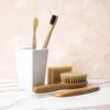 Bamboo toothbrush in a cup and eucalyptus leaf on brown shelf